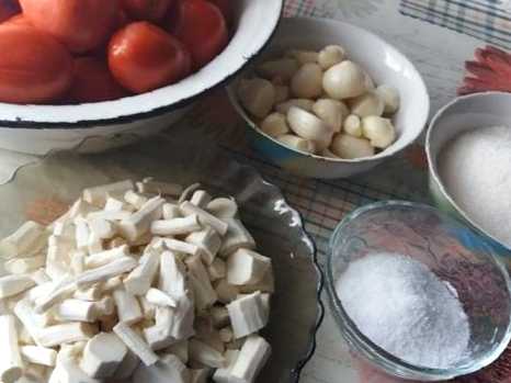 Крок 1. Готуємо усі інгредієнти. Коріння миємо, очищаємо від шкірки і нарізаємо невеликими шматочками. Помідори нарізаємо на половинки чи четвертинки, залежно від розмірів плодів. Часник очищаємо від шкірки.