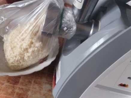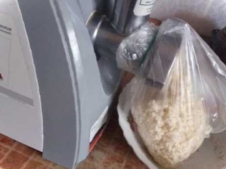 Крок 2. Спочатку пропускаємо через м'ясорубку хрін. Щоб "не плакати", на м'ясорубку одягаємо пакет. Позику пакет прибираємо та зав'язуємо його, щоб ефірні олії нас не дратували.