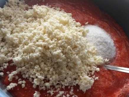 Крок 3. З'єднуємо в тазу прокручені помідори та хрін. Додаємо сіль та цукор і все добре перемішуємо.
