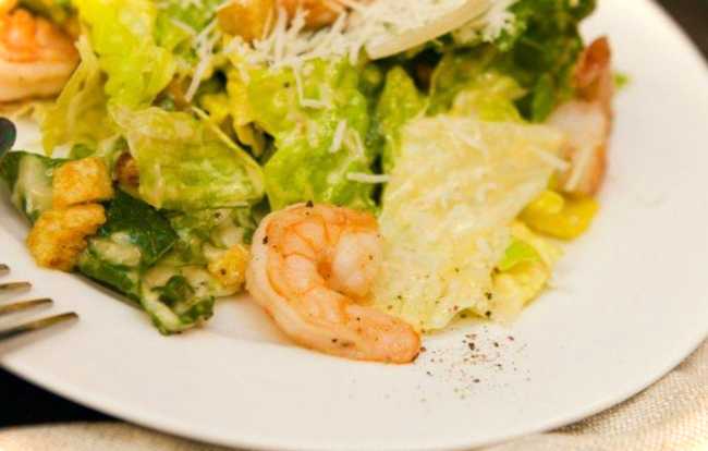 Це ідеальний салат "Цезар" зі складним соусом-заправкою домашнього приготування та креветками, обсмаженими з перцем та лимонною цедрою.