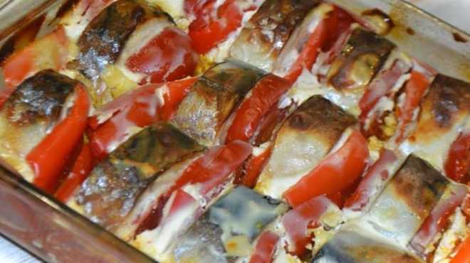Рибу розморозити, почистити, помити і обробити (прибрати голову, плавці та хвіст), нарізати на шматочки. Томати та цибулю нарізаємо, моркву подрібнюємо на тертці, змішуємо, перчимо та солимо. Змащуємо 2 горщики олією. Викладаємо на дно шматочки риби, додаємо по пару столових ложок води, трохи спецій та солі. Робимо прошарок з овочів так, щоб до краю горщика залишилося трохи простору. Так уникнемо закипання соку. Включаємо духовку на 180 градусів, відправляємо закриті горщики на 45 хвилин.