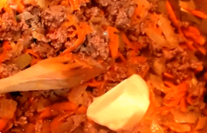 Наступним додаємо фарш, разом з ним додаємо вершкове масло. Перемішуємо все і смажимо до напівготовності, тому що він ще гаситься разом з іншими овочами.