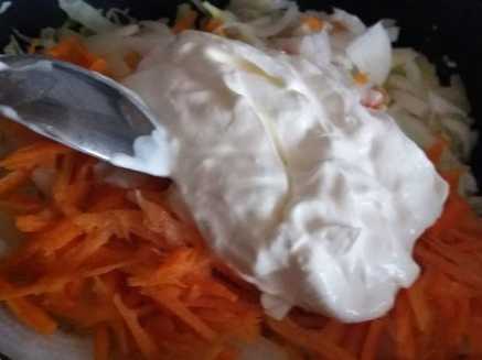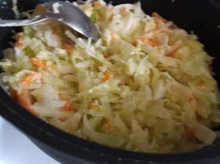 Нарізаємо цибулю та моркву кубиками, обсмажуємо з олією і додаємо до капусти. Туди ж кладемо спеції (мелений чорний перець, перець горошком, гвоздику). Ще додаємо 100 мл теплої води і гасимо до готовності.