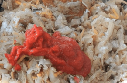 На сковороду додаємо теплу воду (1 склянку) та обсмажену томатну пасту. Перемішуємо. У 100 л води розводимо 0,5 ст. л. оцтової есенції та додаємо в капусті. Гасимо до напівготовності, приблизно 30 хвилин.
