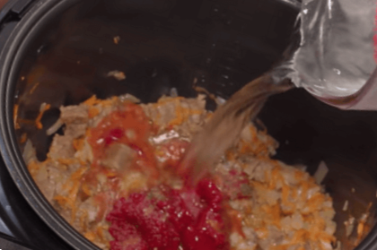 Якщо під час смаження рідина випарується, додайте трохи теплої води. Загальний час смаження м'яса 18-20 хвилин.Додаємо далі 2 ст. л. з невеликою гіркою томатної пасти, 1/3 год. л. меленого перцю, 2 год. л. солі, половину склянки окропу,