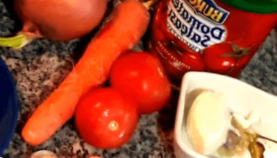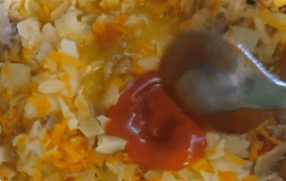Тим часом на сковороду кладемо дрібно нарізану цибулю і нашатковану моркву, додаємо шматочок вершкового мала і трохи води, починаємо гасити доти, доки вода вся не випарується. Коли вода на сковороді з цибулею та морквою випарується, додаємо томатну росту, добре перемішуємо і гасимо ще пару хвилин.