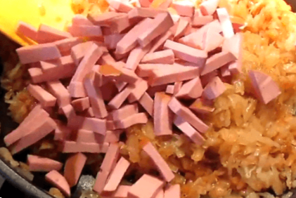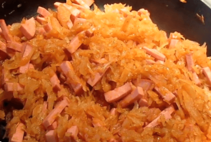 Поки тушкується капуста, нарізаємо ковбасу і додаємо на сковороду, ще раз перемішуємо, закриваємо кришкою і ще гасимо 5-7 хвилин до готовності.
