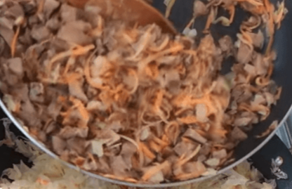 Поки обсмажується капуста, на іншій сковороді обсмажуємо тонко нарізану півкільцями цибулю до прозорості. Потім до цибулі додаємо моркву та обсмажуємо разом. Після цього додаємо нарізані дрібними шматочками гриби і обсмажуємо їх до напівготовності.