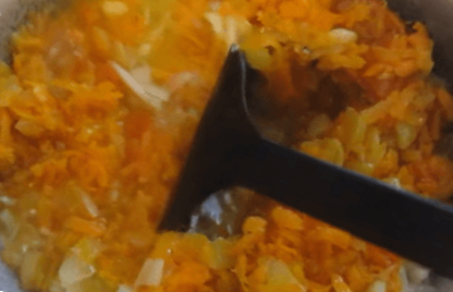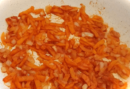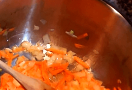 Глибоку каструлю ставимо на вогонь, наливаємо в неї олію, щоб вона покрила дно. Чекаємо, коли олія нагріється і обсмажуємо в ній цибулю та часник, поки цибуля не стане прозорою. Потім додаємо натерту на великій тертці моркву і ще обсмажуємо хвилини дві.