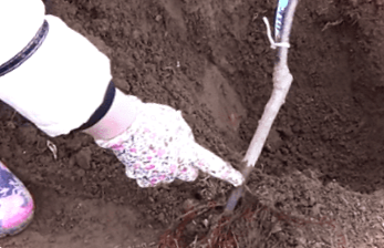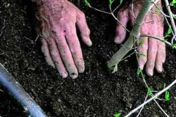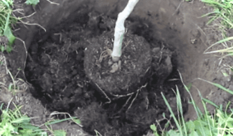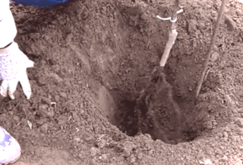 - У середину лунки ставлять деревце і закопують лунку шаром землі. Слідкуйте, щоб точка щепи була вище рівня землі мінімум на 2 см;