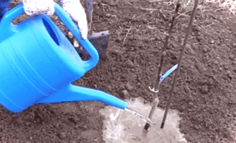 - Знову дуже рясно поливають ґрунт біля деревця. Встромляють поруч кілочків, до якого його підв'язують, щоб деревце при вітрі не розхиталося і не порвалося його коріння.