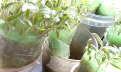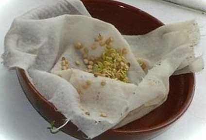 - На марлі у прозорій коробці. На дно її кладуть вологу марлю, а поверх знезаражене насіння. Через 10-12 днів насіння проросте, з'являться невеликі коріння. Проросле насіння пізніше зручно розсадити у вже підготовлену контейнерну скриньку з ґрунтом.