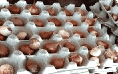 До висадки під зиму цибулини зберігають у сухому прохолодному місці у коробках чи паперових пакетах. Цікава ідея зберігання цибулин тюльпанів – у контейнерах з-під яєць.