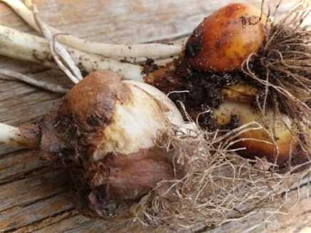 Точніший час можна визначити за лусочками на головці. Викопайте 1-2 цибулини і подивіться, яка на них луска. Якщо вони покриті коричневими захисними лусочками, значить час приступати до викопування. Якщо ж затриматися з вкопуванням, то сама втеча відокремиться від цибулини і її потім буде важко знайти в землі.