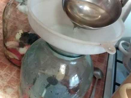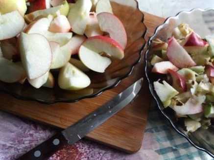 Потім приступаємо безпосередньо до приготування. Фрукти миємо, очищаємо від серцевини та насіння, видаляємо пом'яті та зіпсовані місця, а потім нарізаємо їх на часточки. Нарізані плоди складаємо у чисту скляну ємність.