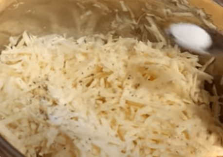 Крок 4. Сир натираємо на великій тертці і приєднуємо до капусти. Додаємо сіль та мелений перець за смаком. Добре все перемішуємо.