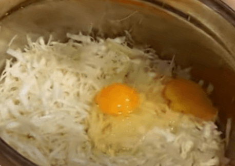 Крок 3. Додаємо яйця. Поки розбиваємо 2 яйця і перемішуємо їх із капустою. Дивимося по консистенції. Можливо, доведеться додати ще одне яйце. Якщо яйця великі, то вистачить і двох яєць.