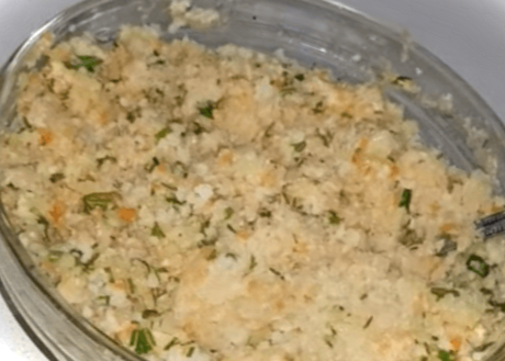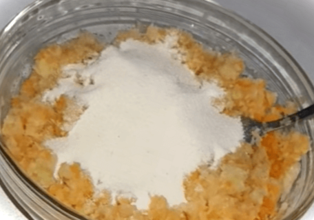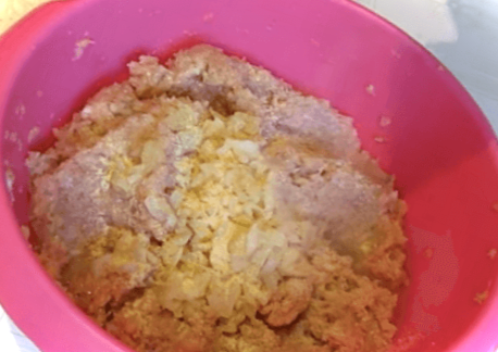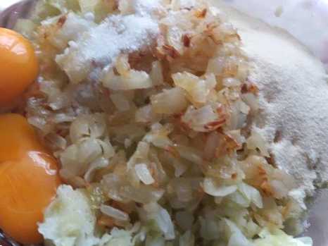 Крок 6. Додаємо в миску яйце, сіль, манку та обсмажену цибулю. Перемішуємо добре, щоб вийшла однорідна маса. Вже в цей момент від смаженої цибулі йде такий аромат, що вже передчуваєш, як же це буде смачно у готовому вигляді.