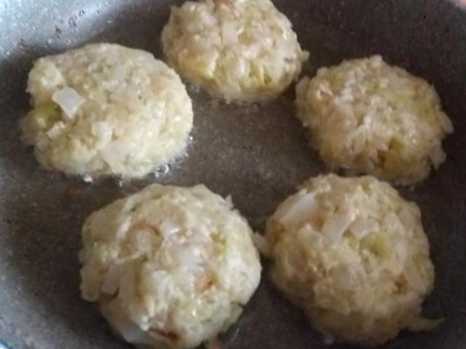 Крок 7. Через 10 хвилин овочева маса готова для приготування. На сковороду наливаємо 2 ст. л. рослинної олії та включаємо вогонь. Ложкою беремо порцію овочевої маси та сирими руками, перекладаючи з однієї руки в іншу, формуємо котлетки або биточки (без різниці) і кладемо на розігріту сковороду. Обсмажуємо їх на середньому вогні спочатку з одного боку 4-5 хвилин до рум'яної скоринки.