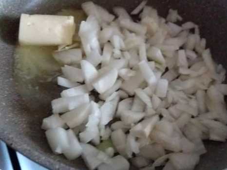 Крок 3. Дрібно нарізаємо цибулю. Ставимо на вогонь сковороду, розтоплюємо в ній вершкове масло і обсмажуємо цибулю до золотистого кольору. Коли цибуля зарум'яниться, вимикаємо вогонь, нехай смажена цибуля злегка охолоне.