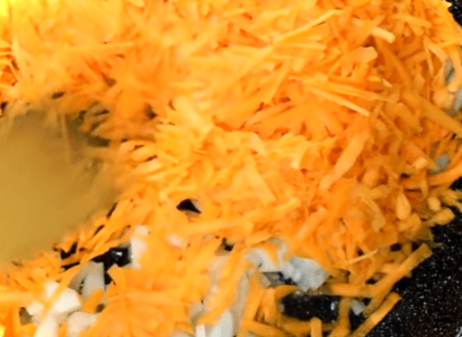 Крок 2. На розігріту сковороду наливаємо олію і обдаровуємо до напівготовності цибулю з морквою протягом 5 хвилин. Не забуваємо періодично перемішувати овочі.