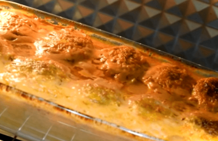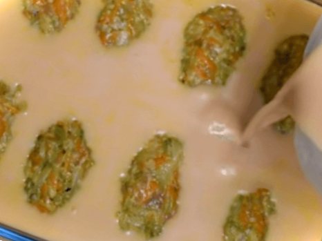 Перемішуємо та соусом заливаємо підготовлені напівфабрикати у формі. Соус повинен покрити їх у формі повністю.