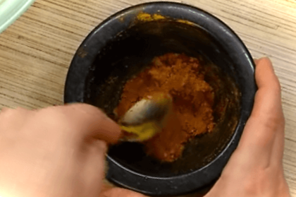 Всі інгредієнти перетираємо у ступці маточкою або в чашці чайною ложкою, щоб вийшла однорідна суміш.