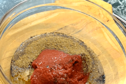 Наступного дня готуємо маринад. У чашку наливаємо олію і додаємо до неї солодку паприку, сушений часник, мелений перець і добре перемішуємо.
