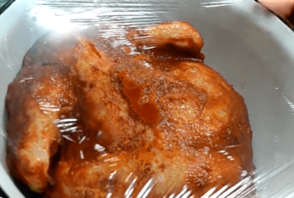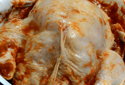 Курочку обмазуємо отриманим маринадом на всі боки зовні і всередині. Місткість з тушкою прикриваємо харчовою плівкою і відправляємо в холодильник на 12 годин, щоб м'ясо промаринували.