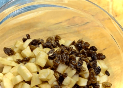 Коли курка промаринується, готуємо начинку. Очищені яблука нарізаємо невеликими кубиками і з'єднуємо з родзинками, попередньо розпареними в гарячій воді.