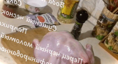 Спочатку тушку необхідно обмити, прибрати в неї зайву шкіру біля шиї та гузку, та обсушити паперовим рушником. Відправляємо поки що її убік і готуємо маринад. Найголовніші інгредієнти для маринаду - часник та сіль. А вже до них можна додати будь-які спеції, які вам подобаються.