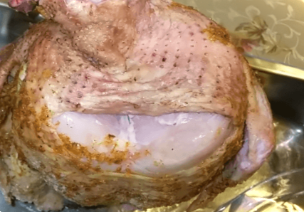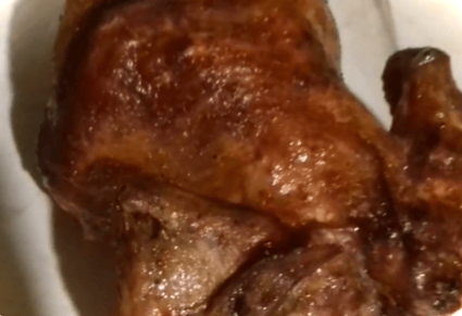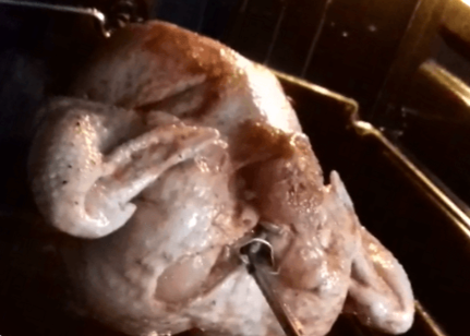 Готову курочку дістаємо та знімаємо її з рожна. Залишається її лише порізати на шматочки.
