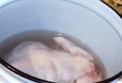 Готуємо тушку, обмиваємо та зрізаємо з неї зайвий жир та непотрібну шкіру. Потім готуємо розсіл. Для цього у великій емальованій каструлі у воді розчиняємо 90 г солі, перемішуємо, щоб розчинилася сіль. І туди опускаємо курку, щоб її розсіл повністю покрив. Залишаємо тушку в розсолі на ніч.