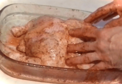 Якщо не буде сушеного часнику, можна взяти 3 зубчики свіжого.Курку дістаємо з розсолу, за ніч вона добре просолилася, з неї вийшли всі шкідливі речовини. Обмиваємо її зверху водою і висушуємо паперовим рушником. Перекладаємо в ємність (форму для запікання, наприклад) і, полив тушку приготованим маринадом, втираємо його зовні з усіх боків та всередині. Залишаємо в такому вигляді на 2-3 години.