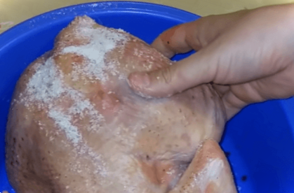 Підготовлену тушку рясно посипаємо сіллю, не бійтеся, зайву сіль м'ясо не візьме. Особливо добре посоліть тушку всередині. Для цього загалом у вас піде не більше 2-3 ст. л. солі. Залишаємо курку на 15-20 хвилин.