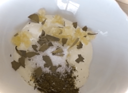 Для приготування маринаду в чашці змішуємо сметану (її можна замінити на майонез), подрібнений часник, чорний перець, сіль, лавровий лист (його можна трохи поламати). Добре перемішуємо до однорідної маси.