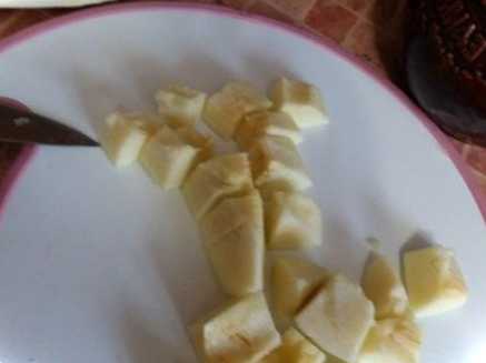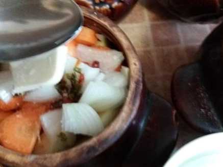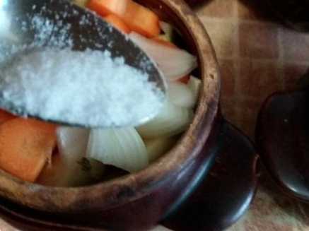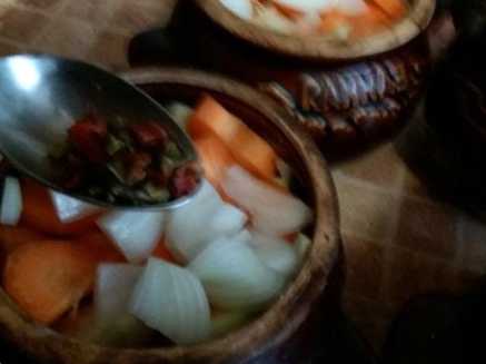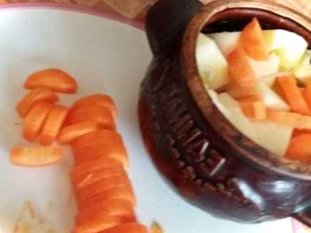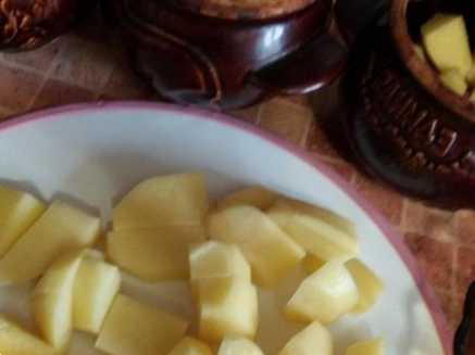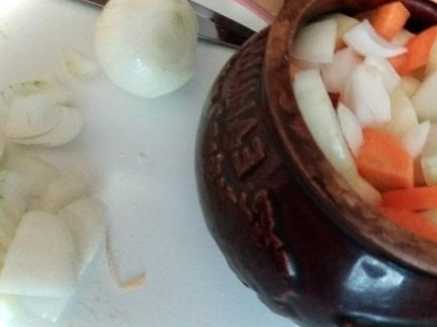 Наступним етапом миємо і очищаємо овочі, відразу їх нарізаємо і складаємо пошарово в горщик. Спочатку на дно кладемо шматочок м'яса з кісточкою, зверху накладаємо картопля, нарізану кубиками.