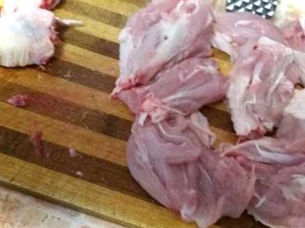 Спочатку займемося курячим м'ясом. Я сьогодні вирішила готувати страву з гомілками. Але з чого б ви не вирішили готувати, філе або частини курочки необхідно нарізати невеликими шматочками, а потім скласти їх у горщики. Я відрубала спочатку непотрібну частину кістки, а потім розрізала гомілку вздовж кісточки, тому одна частина вийшла з кісточкою, а інша без неї.