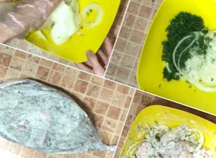 Складаємо підготовлені продукти в пакет для запікання, зав'язуємо його з обох боків та залишаємо для маринування на 1 годину. Потім пакети викладаємо на лист і відправляємо в духовку запікатися на 40 хвилин при температурі 180ºС.