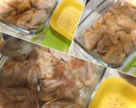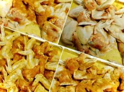 Крила промиваємо, сушимо рушником і відразу ж розкладаємо їх на листі, застеленому пергаментом. Солимо їх за смаком, а потім посипаємо каррі. Ця приправа не має ніякого запаху, але надає легкої пряності, а в процесі запікання надає хрустку скоринку. Слідом посипаємо приправою для курки, ось тут цілий букет трав: мелені коріандр, імбир, паприка, перець червоний, чорний і запашний, куркума, кардамон, каррі, кмин. А тепер все перемішуємо дуже добре, щоб м'ясо змастилося з усіх боків приправами.