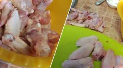 Займемося спочатку крильцями, їх потрібно обмити холодною водою, обсушити паперовим рушником і, якщо є пір'їни, їх потрібно видалити. Розрізаємо по суглобах, останній краще не брати, їх потім покладіть краще для приготування холодця. Усі частини складаємо у глибоку миску.