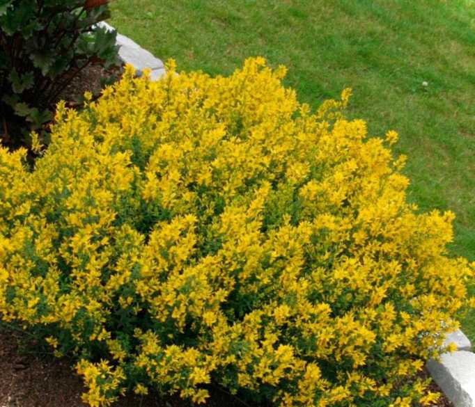 - Дрок - напіввічнозелений кущик, що створює подушкоподібні чагарники. Стебла рясно посипані жовтими квітами.