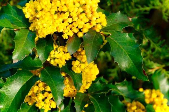 - Магонія падуболістна - повзуча трава з жовтими квітами та колючими листками з пурпуровими плямами.