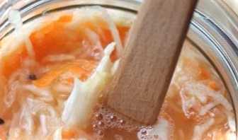 Розсіл доводимо до кипіння, щоб сіль та цукор розчинилися. Залишаємо остигати до кімнатної температури. Тим часом шаткуємо капусту і моркву, злегка їх перемішуємо, потім заповнюємо банку. Втрамбувати не треба. Охолодженим розсолом заливаємо капусту, залишаємо на кухні на 2 доби. Банку ставимо у блюдо, тому що буде витікати сік із банки, зверху прикриваємо блюдцем або шматком марлі.