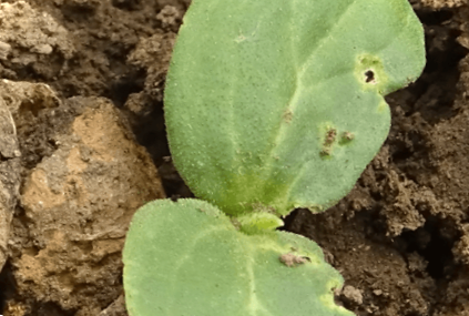 Початкові ознаки хвороби можна вже помітити вже в момент сходу. На семидольних листочках видно пошкодження (плями, дірочки), ніби їх погризли мурахи. А це вже можуть бути ознаки хибної борошнистої роси.