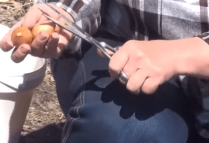Безпосередньо перед посадкою в землю, у цибулини обрізають шийку до плічок, тим самим ми сприяємо найшвидшому проростанню пір'яшок. А ще деякі досвідчені городники злегка обрізають денце, щоб коріння швидше відросло.