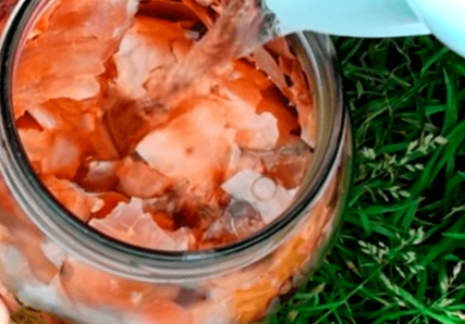 - Літрову банку набиваємо щільно лушпинням. Цей об'єм лушпиння заварюємо 2 л гарячої води, наполягаємо 2 доби, проціджуємо. Перед застосуванням настій розбавляємо водою у співвідношенні 1:2, додаємо 1 ст. л. рідкого мила, щоб краще тримався препарат, і проводимо обприскування рослин або поливаємо з лійки.