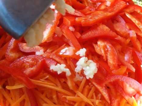 Крок 4. Очищений часник пропускаємо через прес або натираємо на дрібній тертці. Додаємо його теж до овочів.
