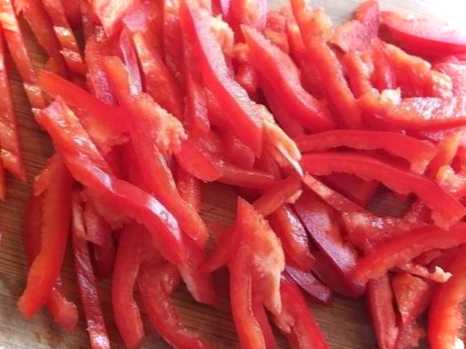 Крок 3. Болгарський перець теж нарізаємо соломкою. Краще нарізати четвертинки навскіс, так вийдуть довша соломка. Відправляємо нарізаний перець до овочів у каструлю.