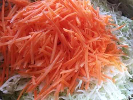 Найголовніше, капуста після перемішування має залишитися щільною. Тільки така потім хрумтітиме.Крок 2. Моркву натираємо на великій тертці. Але я вирішила цього разу натерти її на тертці для корейської моркви. Соломка на цій тертці виходить рівною та красивішою. Додаємо моркву до каструлі.